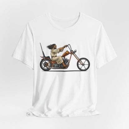 This Jesus on chopper motorcycle tee gives off a rebellious yet spiritual vibe, perfect for motorcycle enthusiasts or those with a unique sense of style. It can be worn casually or as a statement piece, fitting into a rocker or biker aesthetic. Great for wearing on casual outings, music festivals, or as a conversation starter